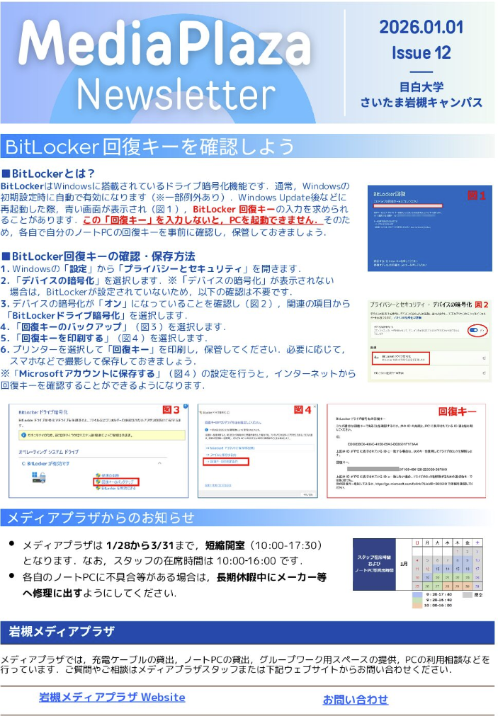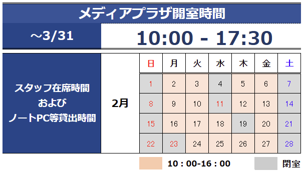 • 1月28日から3月31日まで,メディアプラザは短縮開室(10:00-17:30)です