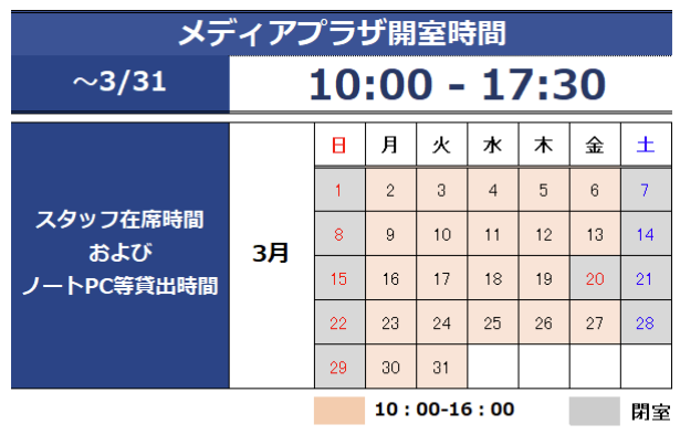 - 1月28日から3月31日まで,メディアプラザは短縮開室(10:00-17:30)です