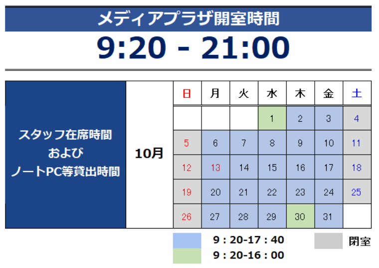 - 質問および相談・備品の貸出はスタッフ在席時間のみ対応しています.ご都合がつかない場合は,岩槻メディアプラザへのお問い合わせをご利用ください.
